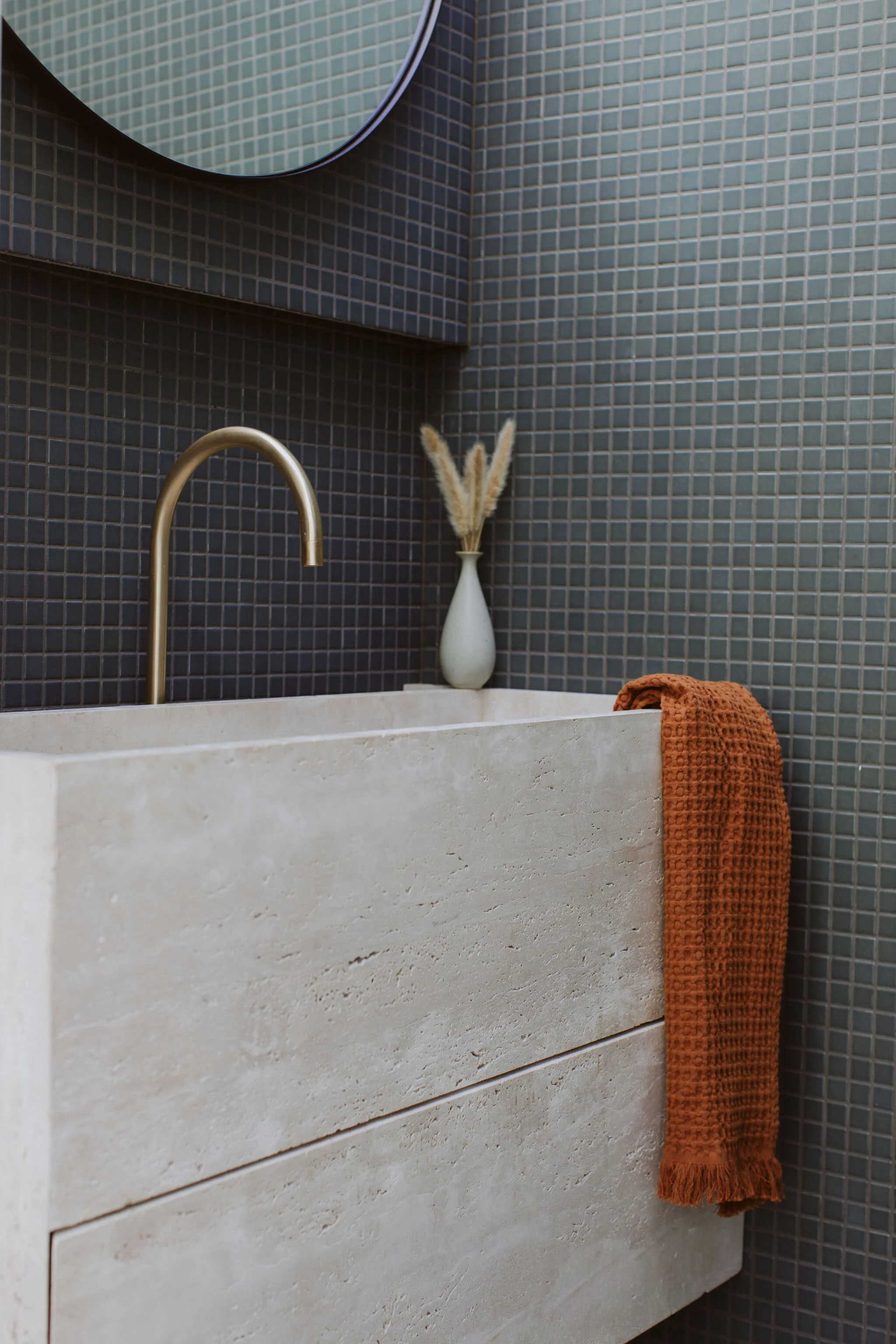 Corban designed and made his own trough vanities from Travertine slabs for each bathroom. Each vanity is slightly different in size, but are all designed with a wide format and without a conventional waste plug.